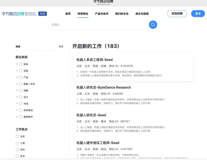 11月5日,界面新闻在字节跳动官方招聘网站上,搜索到183个与机器人有关的岗位,包括机器人系统工程师、机器人硬件测试工程师、机器人产品负责人等。